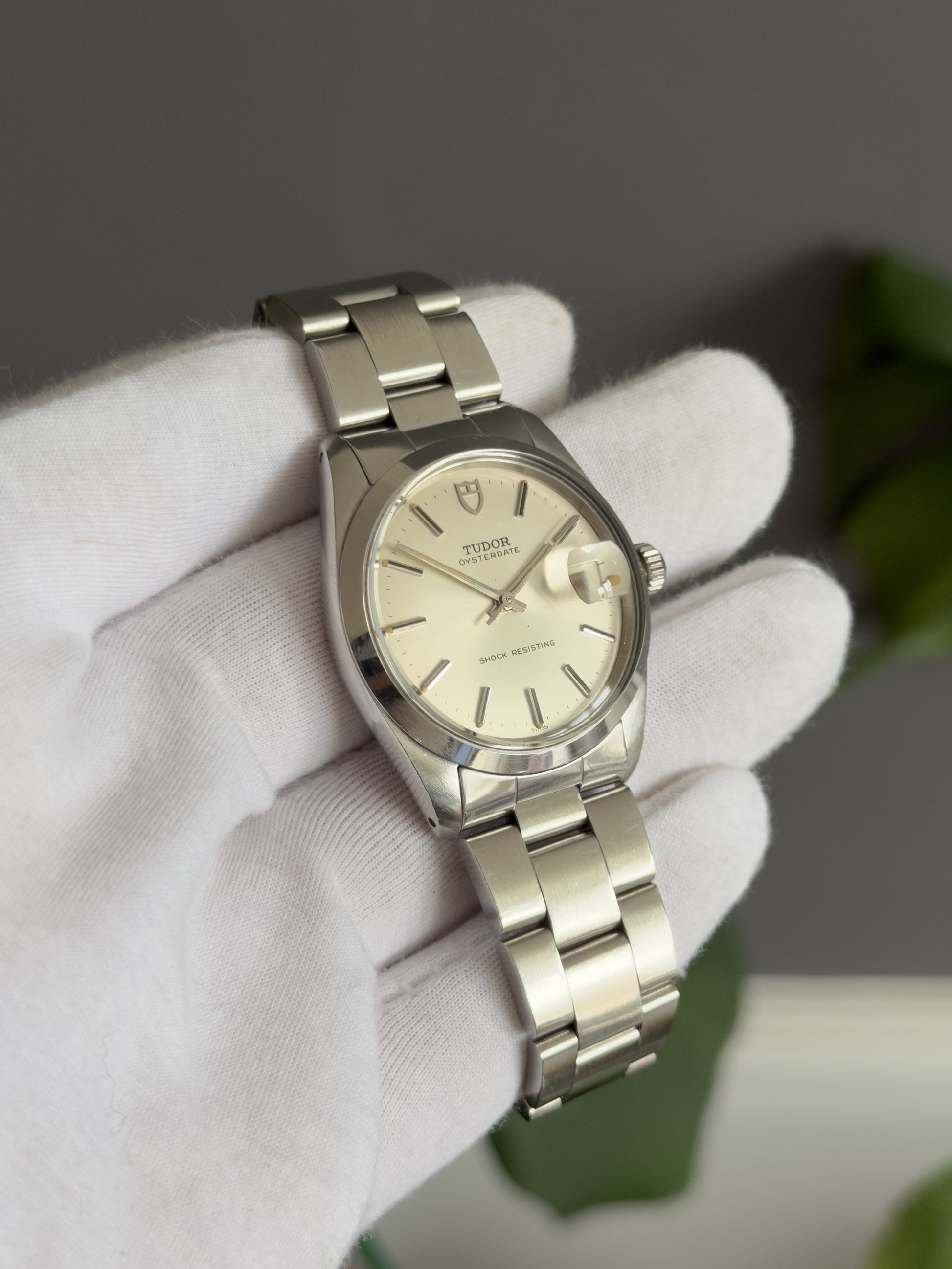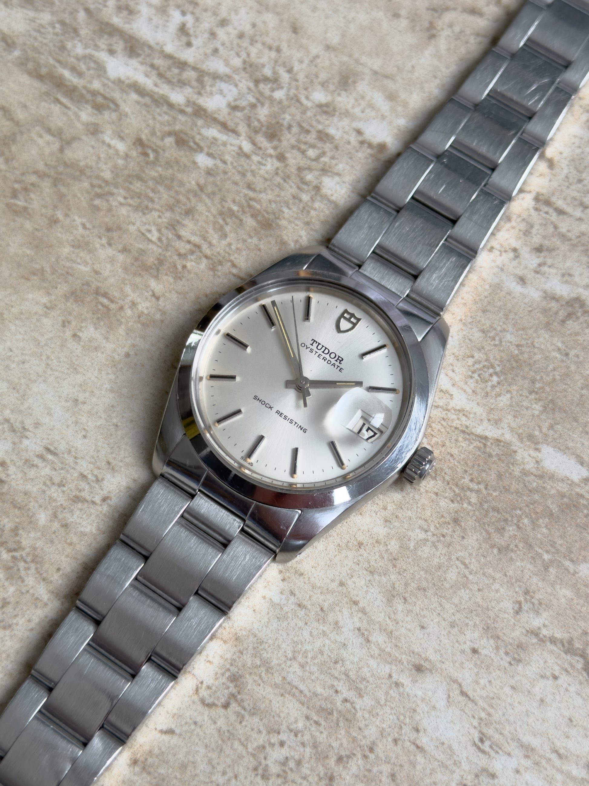 Tudor Oysterdate Ref 7992/0 now in stock at WatchBooth. This watch is paired with an original Rolex bracelet which is in good clean condition on 557 end links. This piece is enclosed in a Rolex oyster case with a Rolex caseback and crown. The watch is in great original condition throughout with minor signs of wear. The movement is in perfect working order and keeping to time well. This is an oysterdate model with a date complication at the 3 o'clock position. The serial number dates this piece to 1977.