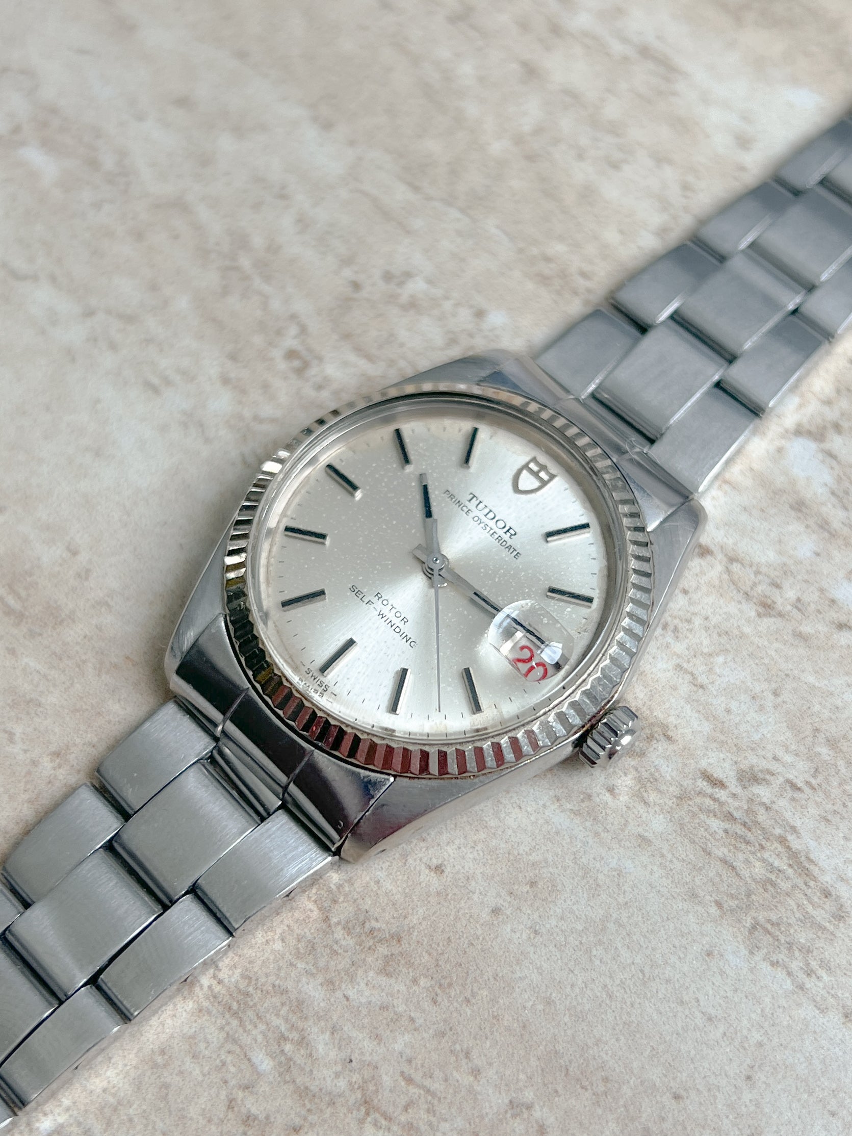 Tudor Prince Oysterdate Ref 7990/4 now in stock at WatchBooth. This watch is paired with an original Rolex bracelet and white gold fluted bezel, plus a rare red/black roulette date wheel making this an extremely unique and desirable example. This piece is enclosed in a Rolex oyster case with a Rolex caseback and crown. The watch is in great original condition throughout with minor signs of wear. The movement is in perfect working order and keeping to time well.